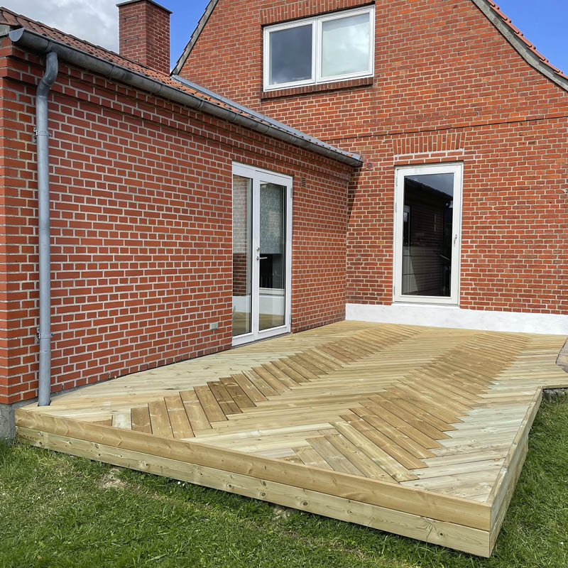 Tämä terassi on tehty betonilaattojen ja valettujen tolppakenkien varaan. Pinnalle on asennettu painekyllästetyt terassilaudat.
