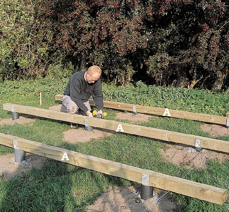 Lattiapalkit (A) asetetaan pilari-kenkiin ja kiinnitetään 6 x 40 mm:n kuusiokantaruuveilla. Kaikkien lattiapalkkien yläreuna kannattaa suoristaa vielä kertaalleen vesivaakaa apuna käyttäen ennen kuin ne kiinnitetään lopullisesti.