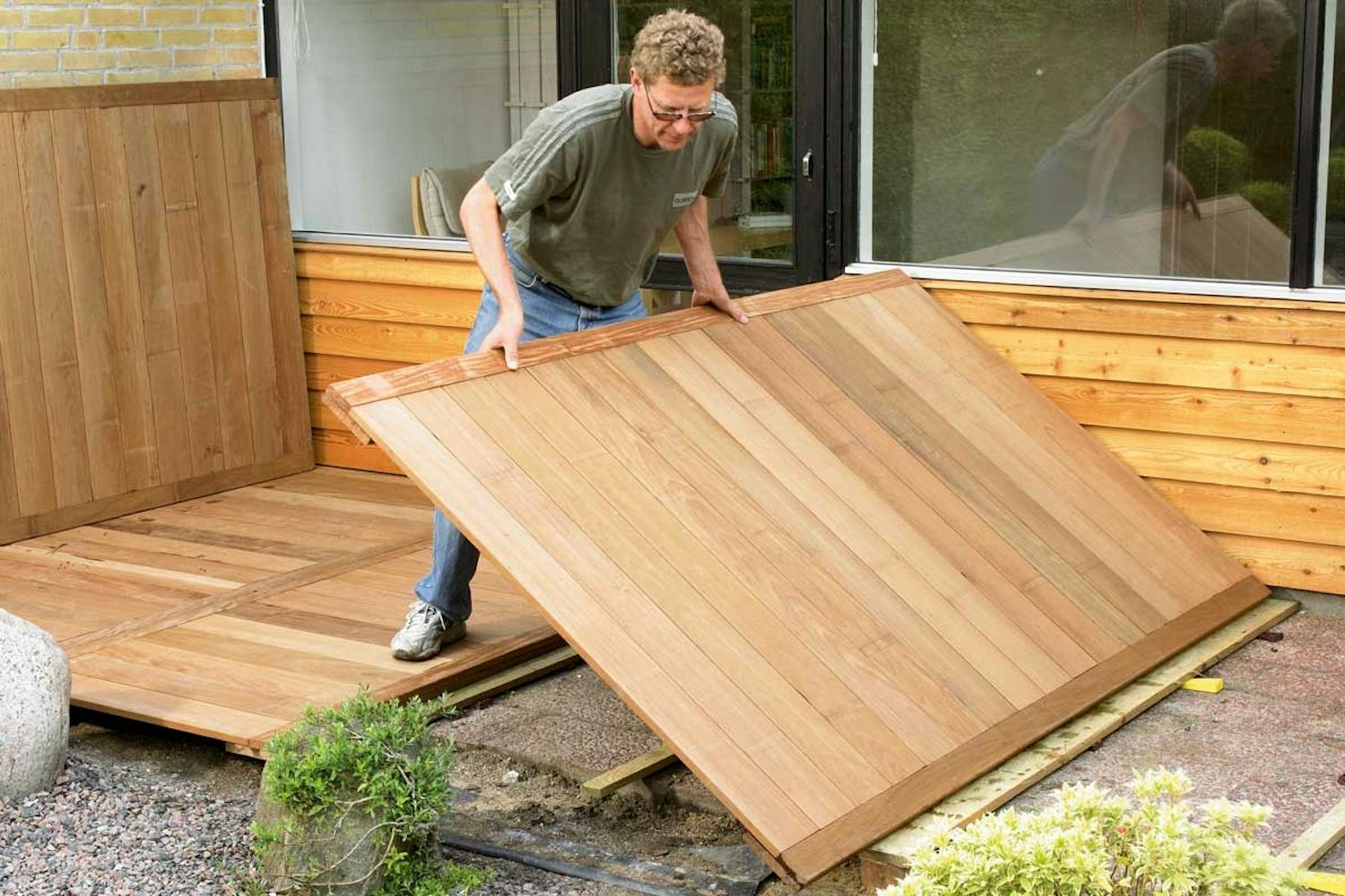 Ensin otamme terassin mitat päättääk-semme viiden lattiamoduulin koot. Niiden tulee sopia puutarhan vastaisen julkisivun oviin ja ikkunoihin. Mitattaes-sa on hyvä muistaa, että seinät voivat olla vinot, joten mittauksessa on oltava tarkkana. Jos vähennät pienimmästä mitasta kaksi senttimetriä, sinulla on hieman pelivaraa aseteltaessa moduu-leja paikoilleen. Tukipuita sijoitettaessa kannattaa rakentaa suuri kulma, jotta voit mitata tukipuiden tolppien paikat tarkalleen. Tukipuita paikoilleen nostet-taessa kannattaa olla kärsivällinen. Lattian perustasta täytyy saada yhtä tukeva joka kohdassa.