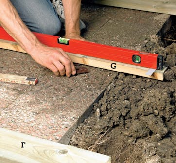 Valmista tukipuille (F) perusta. Tue tukipuut muovikiiloilla, jotta ne tukevat koko moduulin alustaa yhtä tasaisesti. Ruuvaa kiilat kiinni vanhoihin laattoihin tai vala ne betoniin, jotta ne eivät pääse liikkumaan.