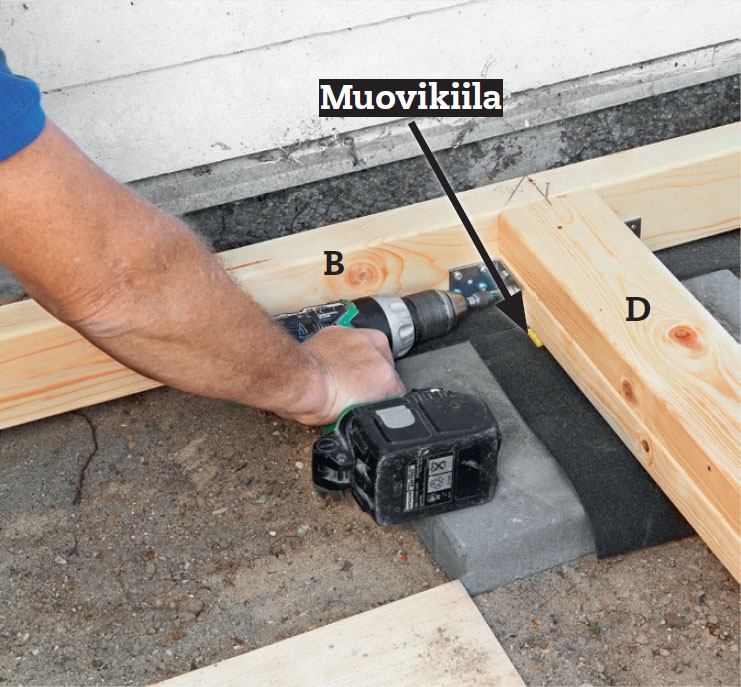 Jatka seuraavaan palkkiin (C). Tue myös tämä laattojen ja bitumihuopapalan päälle, ennen kuin liität kulman yhteen 5 x 90 mm ruuveilla.