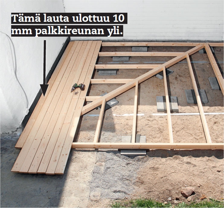 Sahaa lautojen päät. Jälleen on sahattava keskeltä tuplapalkkia, sillä rakennamme suorakulmaista terassia. Jos terassista ei haluta suurempaa, sahaa laudat niin, että ne ylettyvät 10 mm reunan yli.