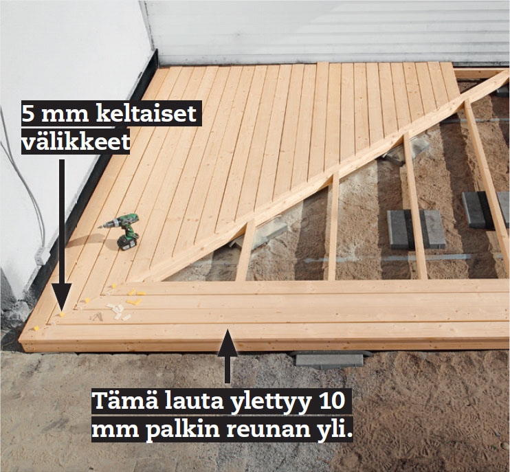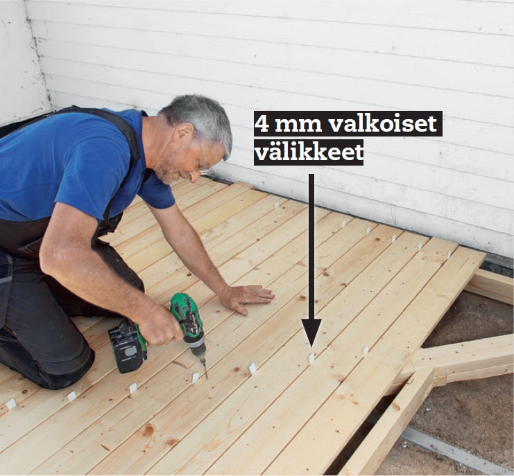 Aseta ensimmäiset laudat 4 mm:n raoin. Käytä muovivälikkeitä, jotta rako pysyy samankokoisena kauttaaltaan. Reunimmainen lauta ulottuu 10 mm alla olevan palkin reunan yli, jos tila sallii.