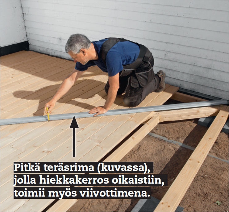 Kun kaikki laudat on asennettu, ne kiinnitetään ruuveilla myös kannattimiin. Voit nähdä rakojen läpi, miten ne sijoittuvat. Merkitse lautoihin viivat, niin saat ruuvit suoriin riveihin.