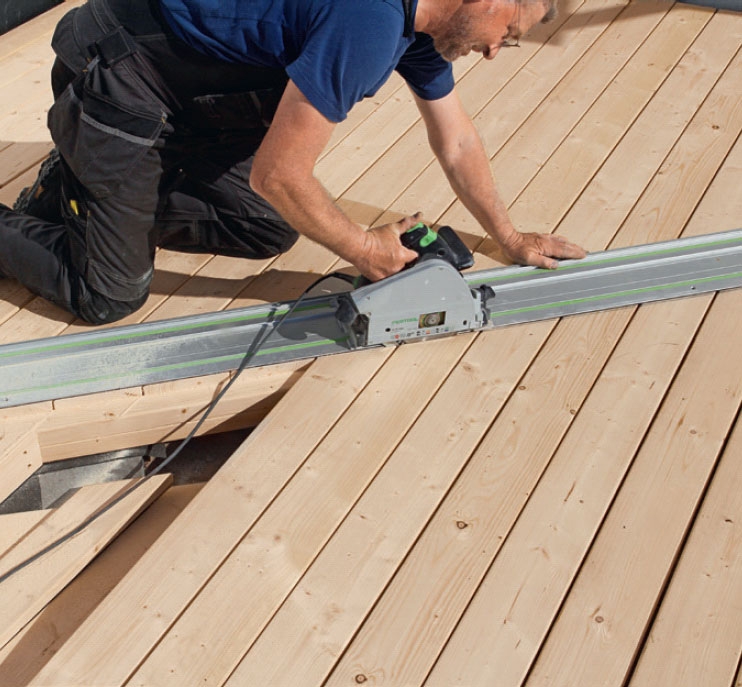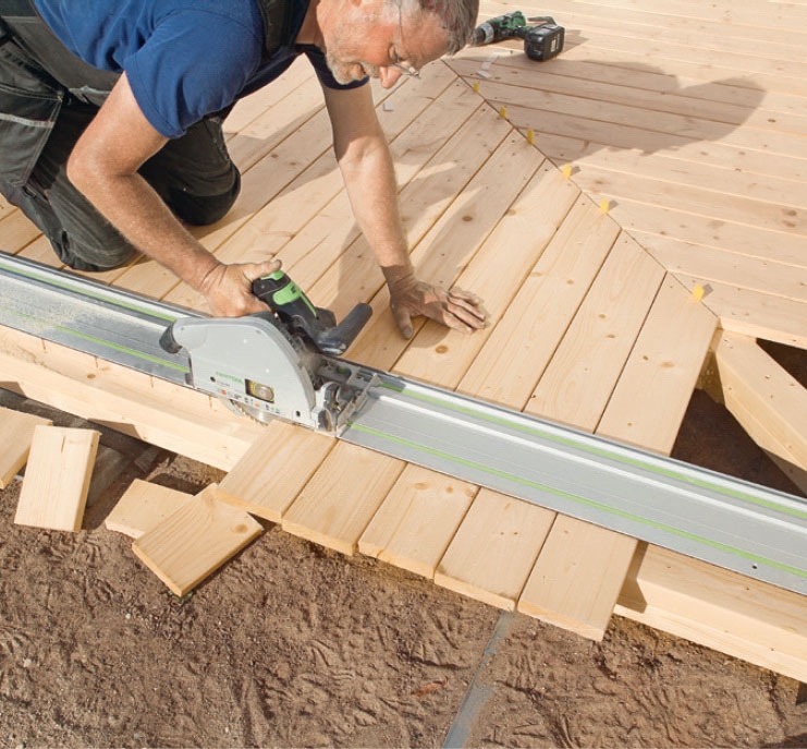 Sahaa nyt pitkä viisto viilto pyörösahalla ja ohjainkiskolla. Jos et omista sellaista, voit käyttää teräsrimaa tai pitkää, suoraa lautaa. Säädä sahanterä niin, että se katkaisee laudat mutta ei ylety alla oleviin palkkeihin asti.