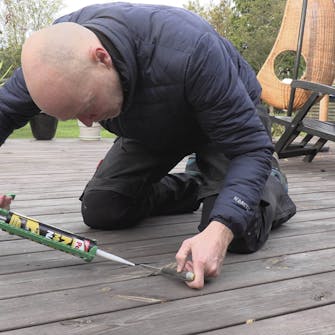Pane rimanpätkä korjatun kohdan päälle. Muista pyyhkiä pois ylimääräinen liima, jotta rima ei tartu kiinni terassiin.