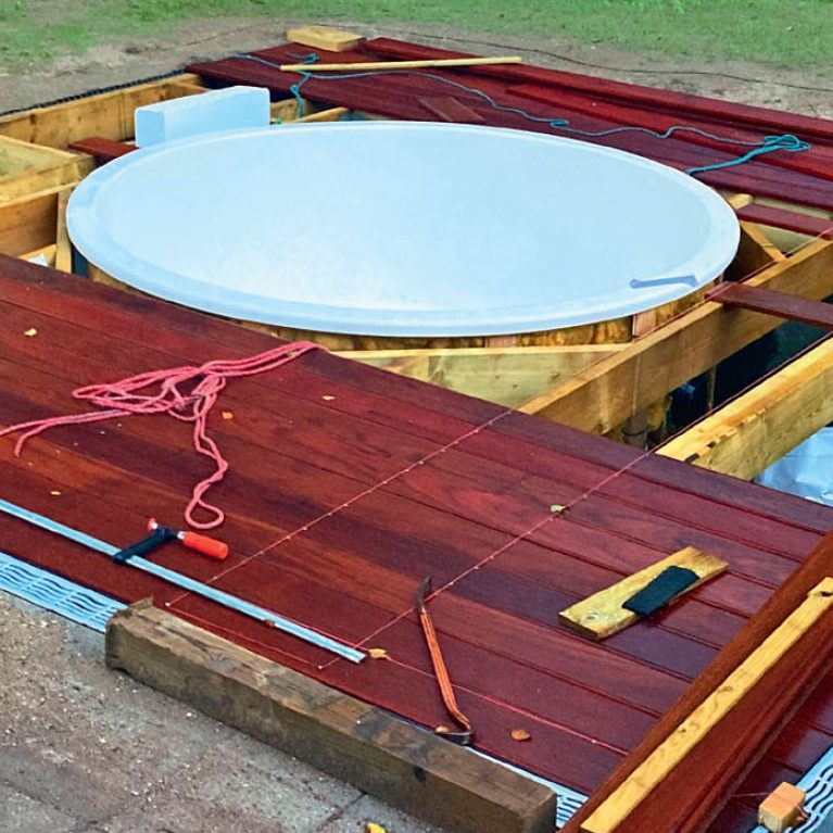 Sitten on aika asentaa perustusharkot ja täyttää ne betonilla. Kun se on kovettunut, harkkojen päälle asennetaan patolevyt, jotta maan kosteus ei imeydy harkkoihin. Lopuksi voit rakentaa terassille rungon, eristää ammeen ja tehdä terassin.