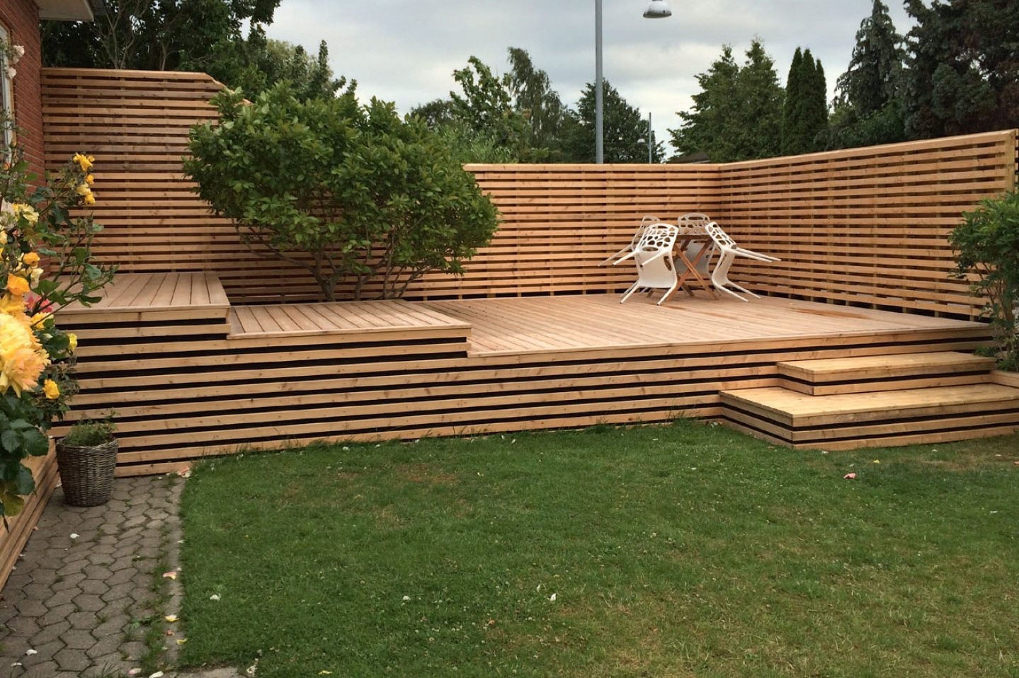 Se voi myö-täillä viistoa maastoa, mutta siihen voi myös työstää useita eritasoisia pintoja rytmiä lisäämään silloin, kun maasto on hyvin tasaista. Lisäksi eri tasoilla voidaan välttää lautojen jat-kaminen pituussuunnassa, mikä itse asiassa helpottaa rakentamista.