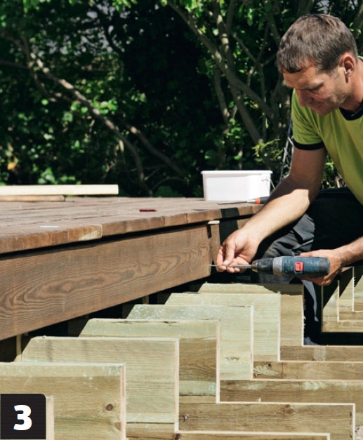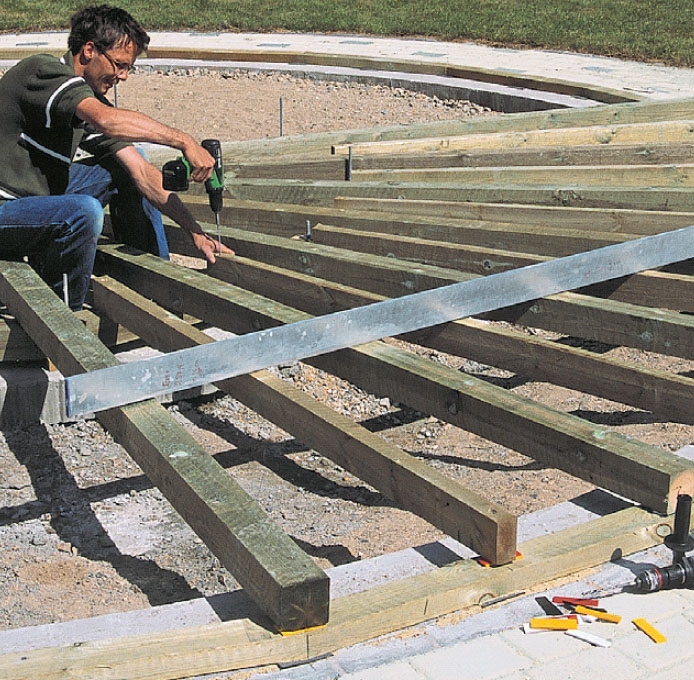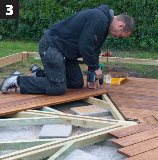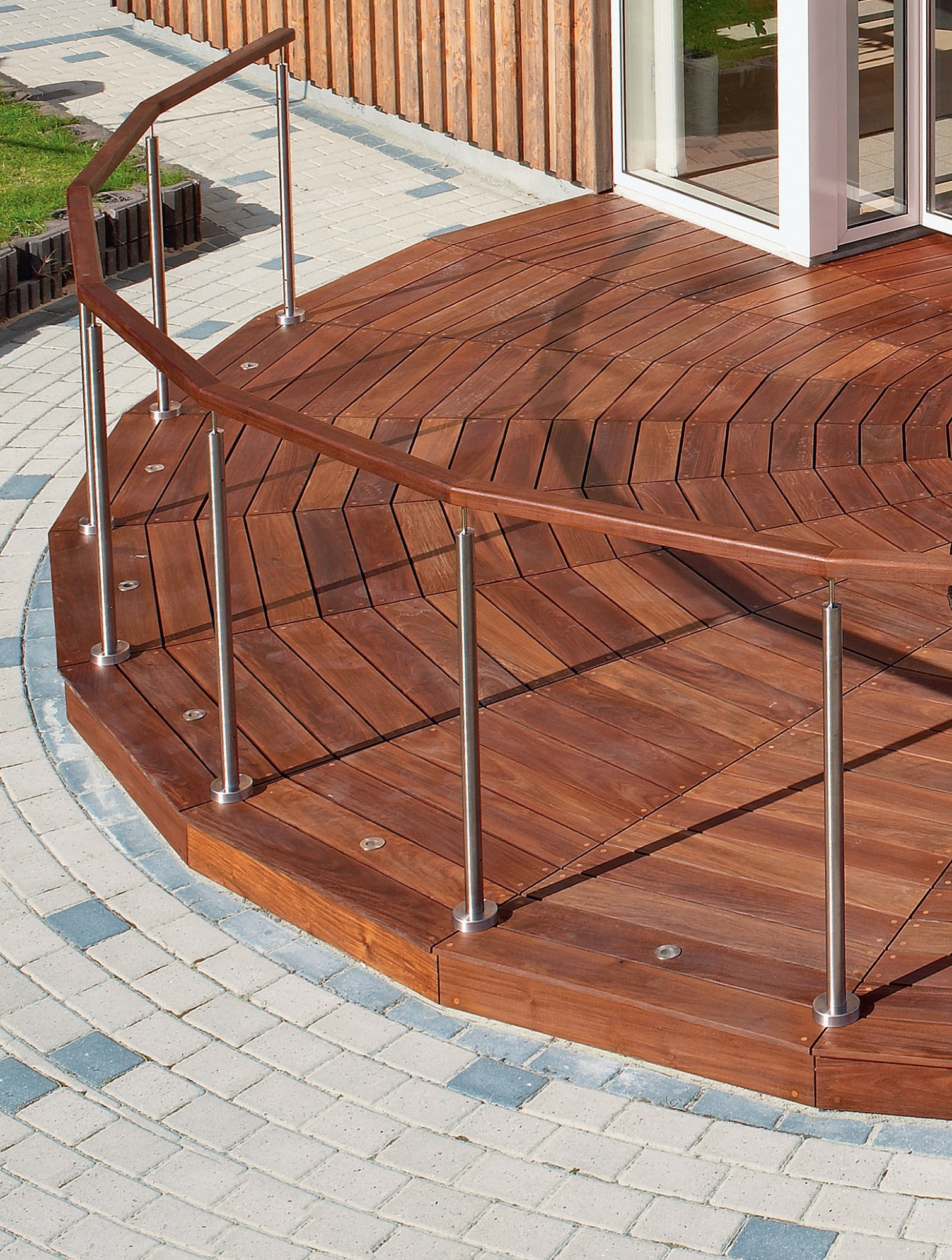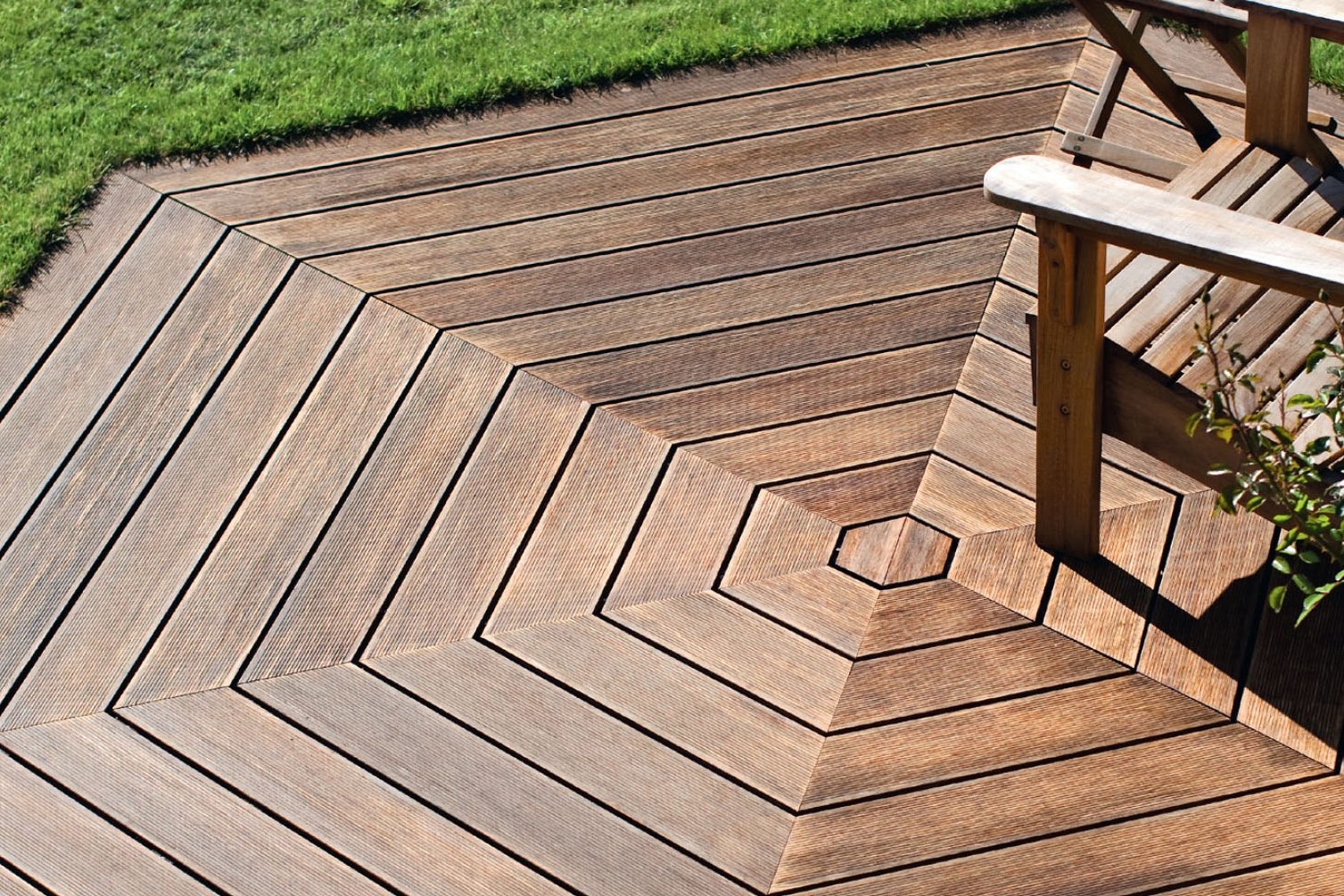 Jos haluat terassiisi lisää muotoa, voit jakaa sen pienempiin kenttiin. Tämä voi olla tarpeen, jotta terassiin ei tarvitse käyttää hentoja, ohuita puukappaleita. Kaarevan kaavan voi luoda näin, kuten teemme tässä kuvan upeassa pyöreässä, 24-kulmaisessa terassissa.