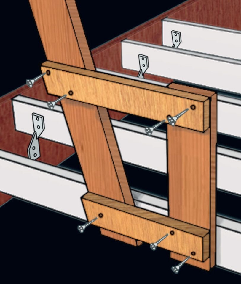 Portaat on usein helppo rakentaa. Kiinnitämme ensin kannattimet palkkien päälle alimman askelman alle.