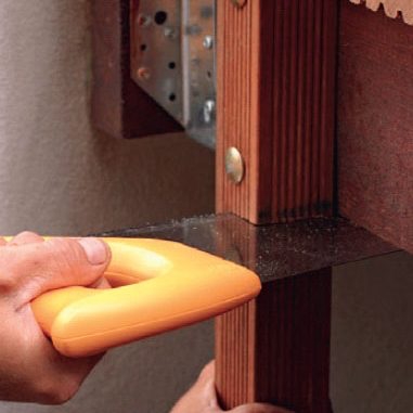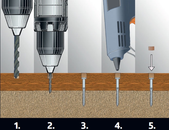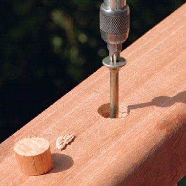 Tämä käy yleensä hyvin huomaamattomasti käyttämällä terassilautojen kanssa samasta puulajista tehtyjä tulppia. Jos sahaat tulpat jostakin toisesta puulajista, ne toimivat myös upeina koristeina.