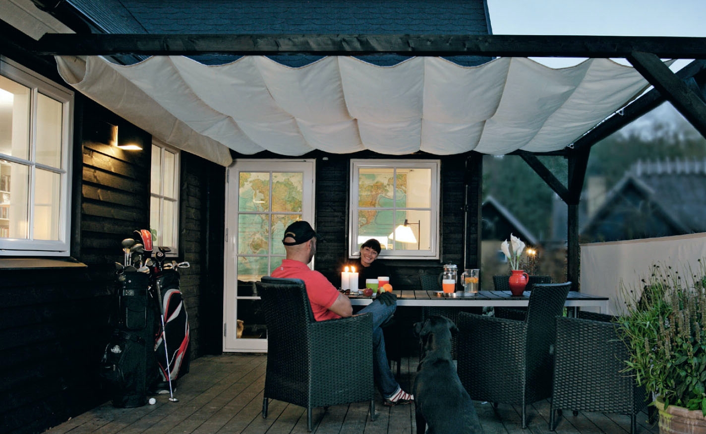 Köynnöskasvien rehevöittämä pergola, tarpeen tullen esiin nostettu purje tai puolikatos - erilaiset katokset ja katteet voivat lisätä terassin käyttöaikaa useilla tunneilla, sillä ne varjostavat keskipäivän kuumuudessa, suojaavat sateelta ja säilyttävät lämmön auringon laskiessa. Kuvissa näet purjekankaan, joka on ripustettu terassin päälle asennetuista vaijereista.