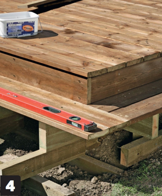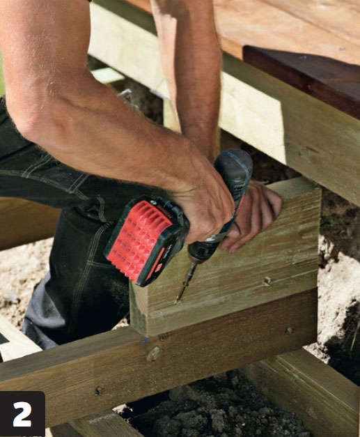 Puuterassin alle on lähes aina helpointa rakentaa kaksitasoinen runko. Ensimmäinen taso kiilataan tai ruuvataan niin, et tä se on samassa tasossa, jotta monien pitkien palkkien asennus sujuu ongelmitta.