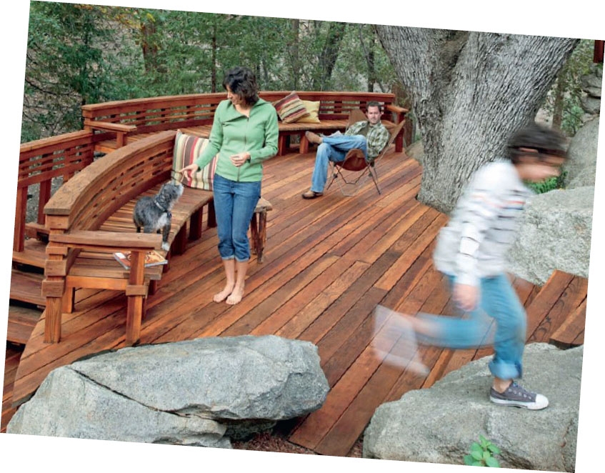 Tiukan suorakulmainen terassi on toki hieno, mutta terassi saa täysin oman ilmeen, kun sen reunat saavat hiukan kaartua. Suorista kulmista ja suorista reunoista pääsee helposti eroon asentamalla terassin tavalliseen tapaan ja sahaamalla lautojen päät niin, että ne muodostavat kulmia tai kaarteita. Tämä on helppo tehdä, sillä terassin rungon ei tarvitse myötäillä reunalinjaa orjallisesti, ja voit hyödyntää tätä tekniikkaa asentamalla terassilaudat ylipitkinä ja sahaamalla ne pyörösahalla yhdellä pitkällä viillolla suoraa tai kaarevaa kaavaa pitkin.