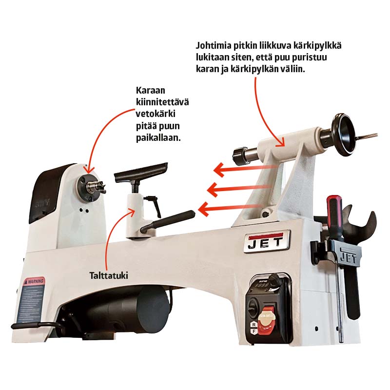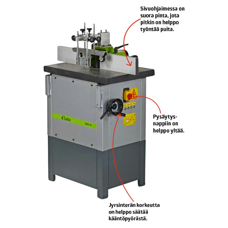 Terä tekee puuhun tyylikkään kaarevan reunan, jonka alareunaan jää vaakasuora pykälä. Pykälä johtuu siitä, että alhaalla oleva kuula-laakeri on pienempi kuin terän alareuna.