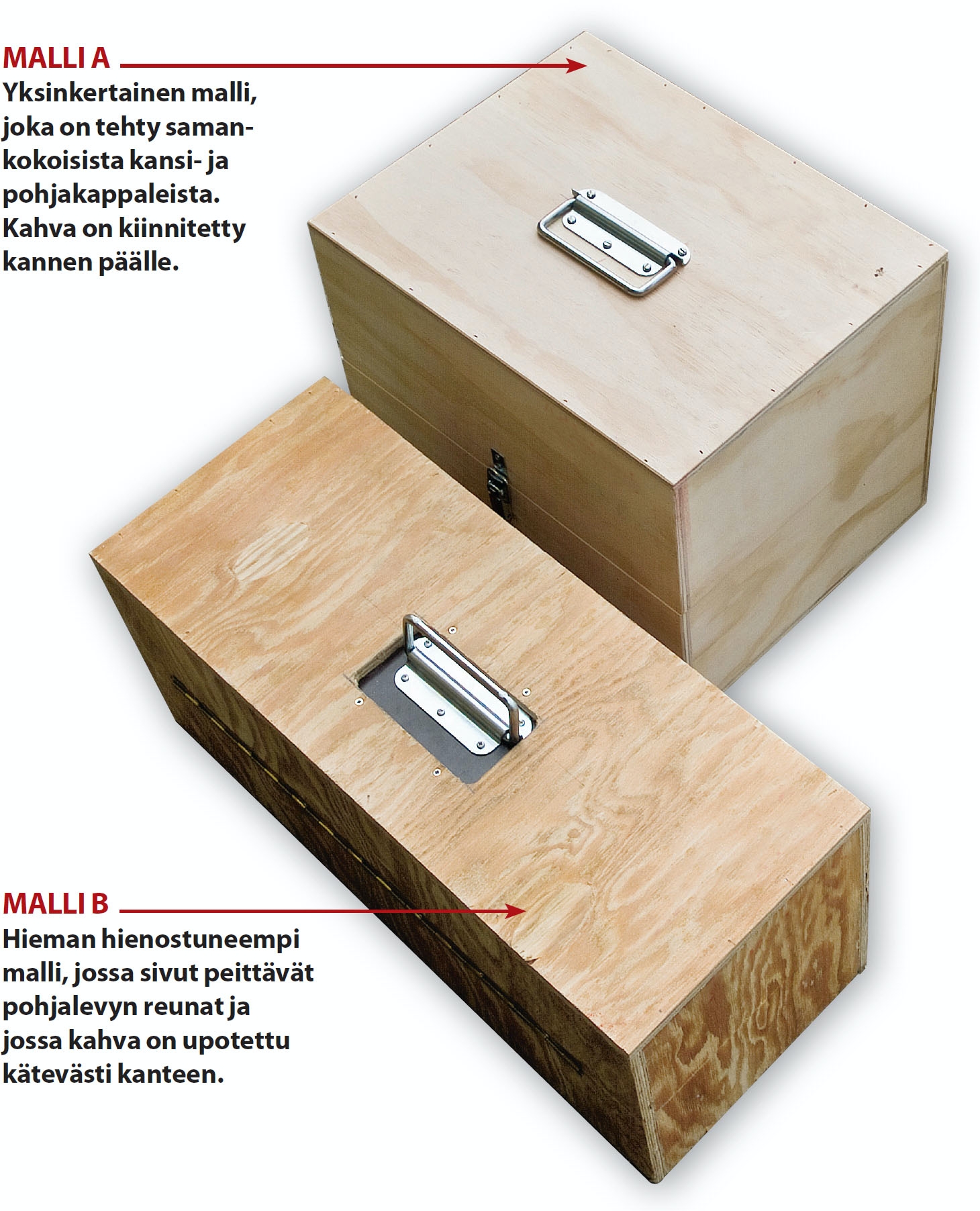 B-malli, jossa pohja on kokonaan sivu-jen sisäpuolella, on rakenteeltaan vah-vin. Hakaset ammutaan poikittain liitok-seen kohdistuvaan vetoon eli laatikossa olevien työkalujen painoon nähden. Laa-tikon on kestettävä sama paino myös silloin, kun sitä nostetaan kahvasta.