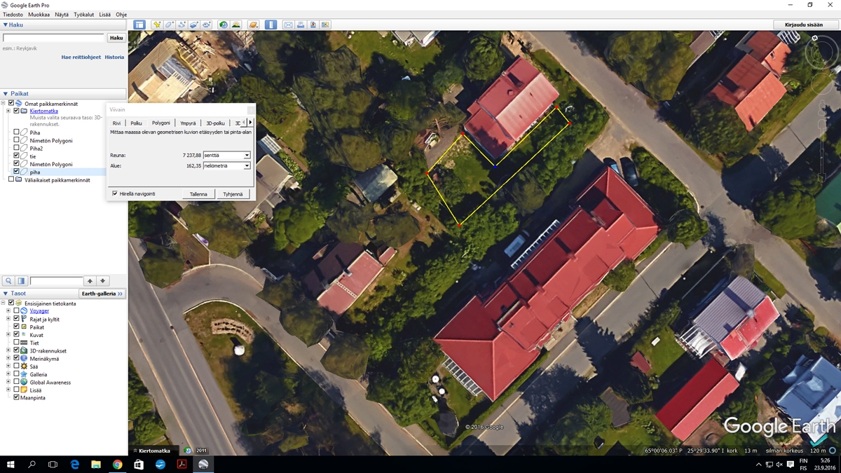 Google Earth Pro toimii sekä Macilla että pc:n Windows-järjestelmillä. Voit aloittaa mittaamisen heti, kun olet ladannut ohjelman. Ohjelmalla on helppo ottaa karkeita mittoja. Muista kuitenkin se, että Googlen kartta ei ole sataprosenttisen tarkka. Ohjelman paras mittaustyökalu on Polygon, joka laskee mitat automaattisesti ruudulle tehdyistä klikkauksista. Polygon laskee kuinka monta kulmaa ja linjaa tahansa. Siitä on iso etu, sillä laskettavat alat eivät aina ole suorakulmion muotoisia.