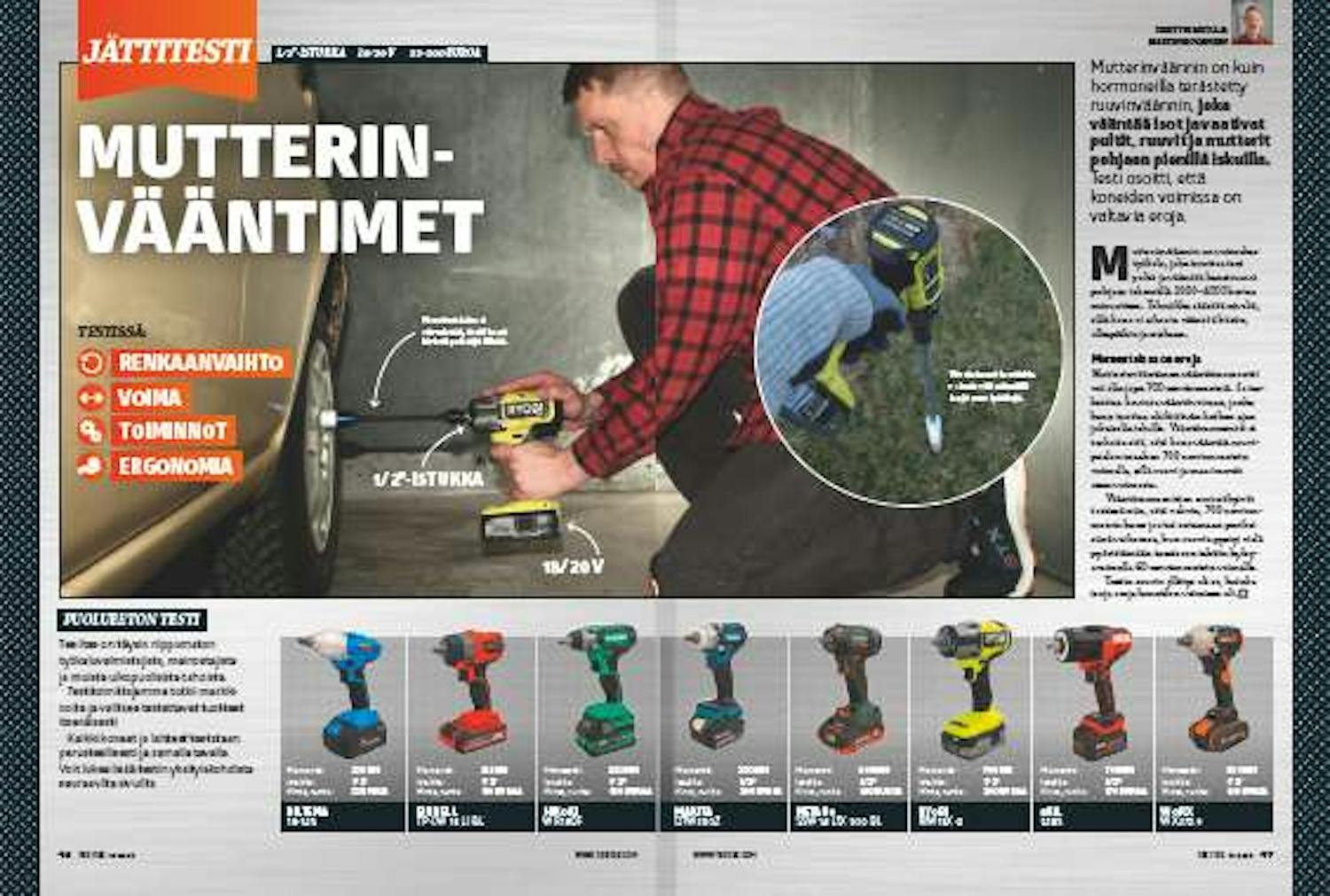 Mutterinväännin on erinomainen työkalu renkaanvaihtoon. Testasimme koneen momenttisauvojen kanssa, jotta pultit eivät kiristy liikaa. Säädimme vääntömomentit 100 ja 150 newtonmetrin kohdalle.