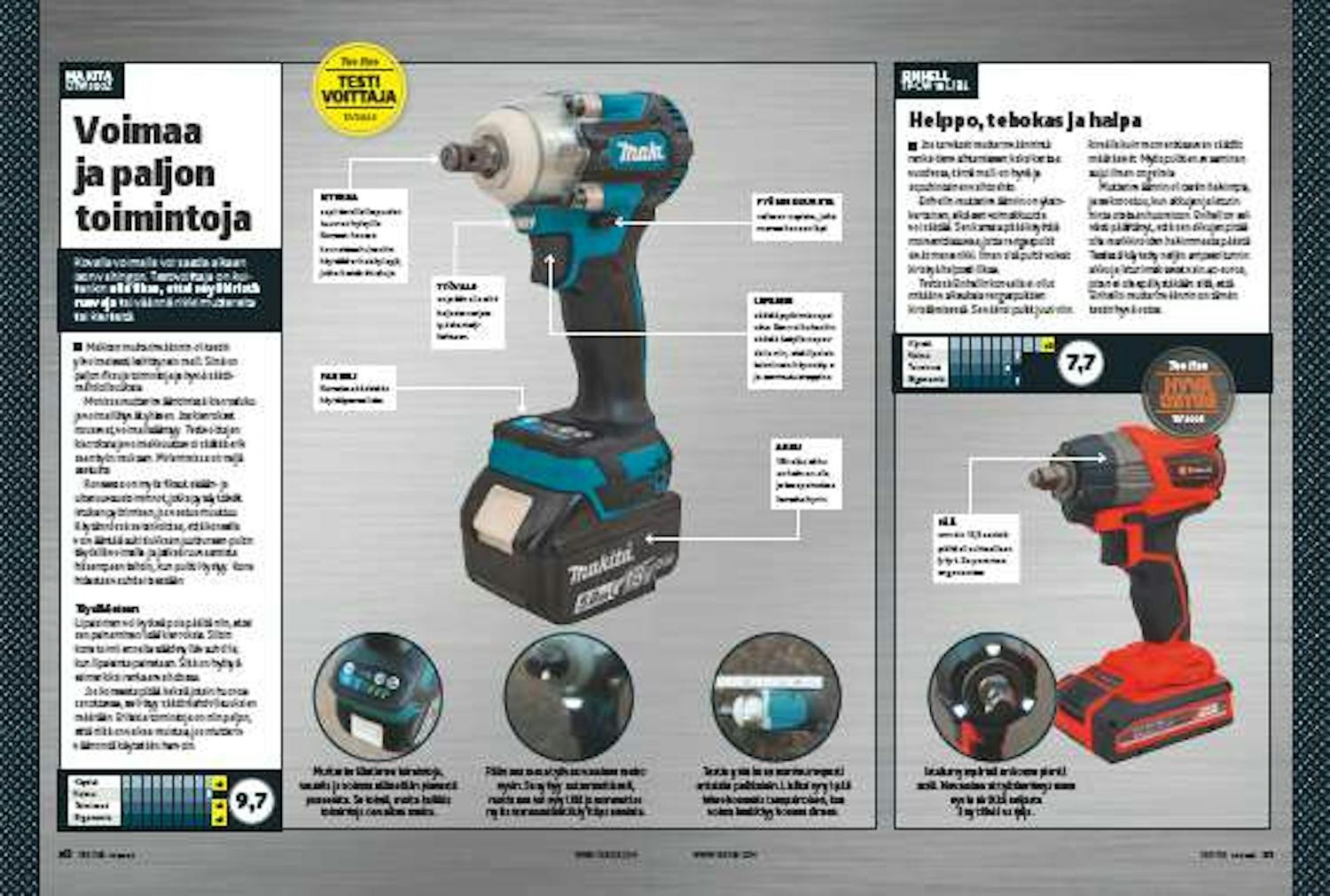 Makitan mutterinväännin oli testin ylivoimaisesti kehittynein malli. Siinä on paljon fiksuja toimintoja ja hyviä säätö mahdollisuuksia.