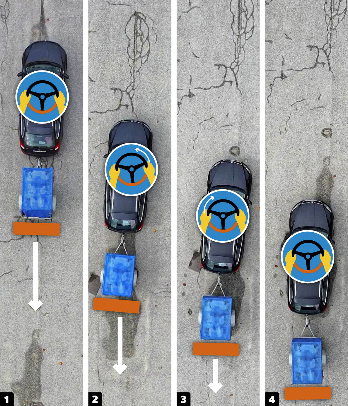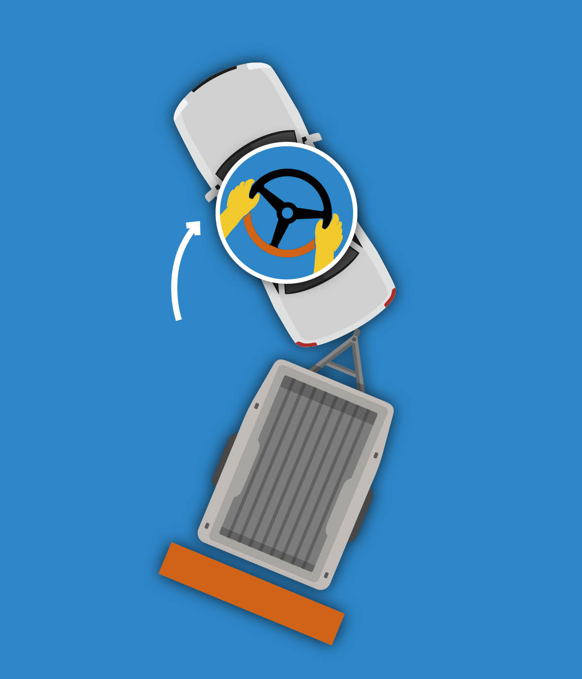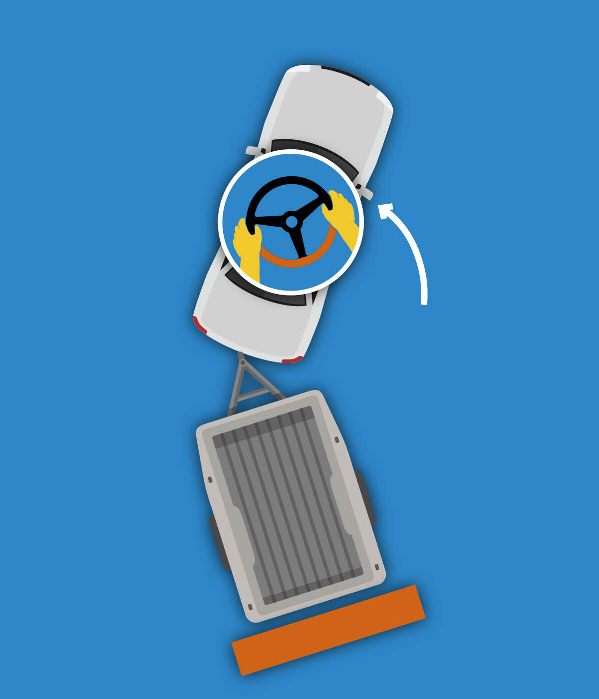 Mihin suuntaan peräkärry kääntyy, kun käännät rattia? Peruuttaminen vaatii jonkin verran järkeilyä. Kuvittele siksi, että auton ratin alareuna on kuin peräkärryn peräpää. Kun rattia käännetään ja sen alareuna osoittaa vasemmalle, myös peräkärry hakeutuu vasemmalle.