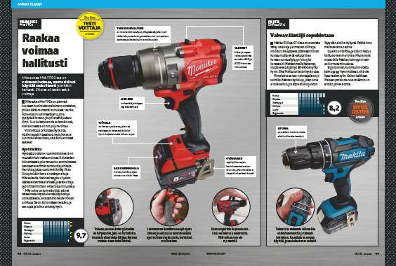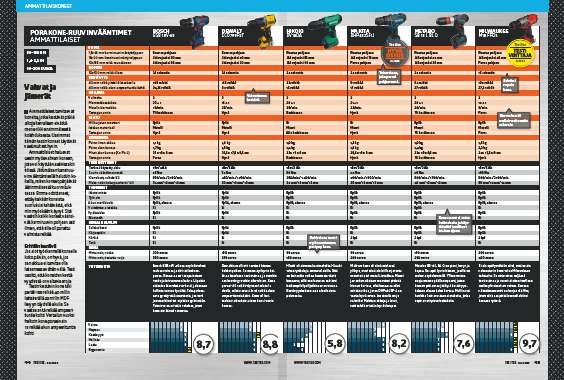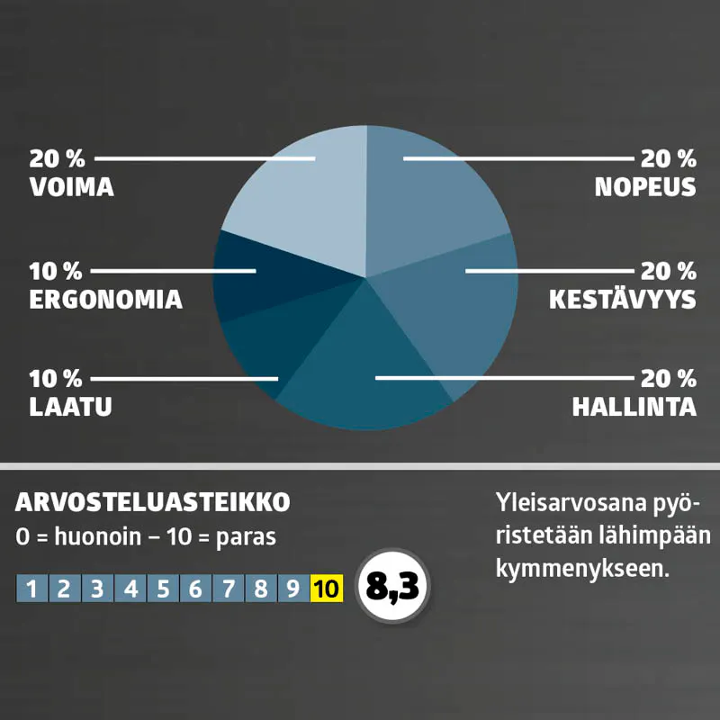Porakone-ruuvinvääntimet testataan ja arvioidaan näillä neljällä osa-alueella: Voima, nopeus, kestävyys, hallinta, laatu ja ergonomia.