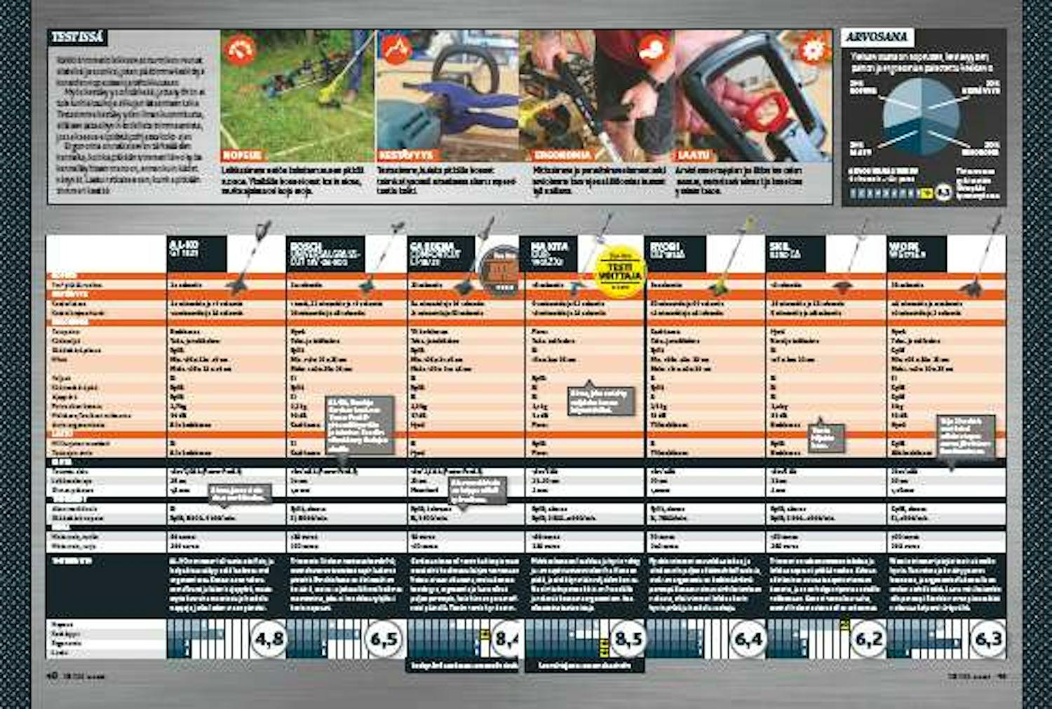 Myös kestävyys on tärkeää, jotta työhön ei tule turhia taukoja akkujen lataamisen takia. Testasimme kestävyyden ilman kuormitusta, sillä se vastaa hyvin todellista trimmaamista, jossa kaasua ei pidetä pohjassa koko ajan.
