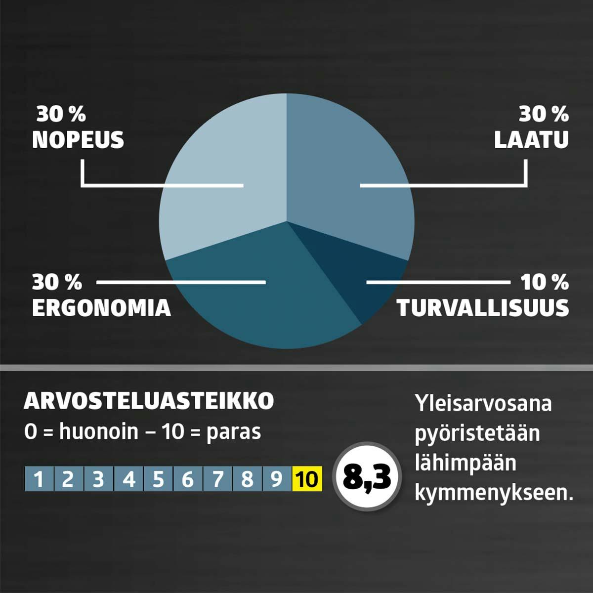 Lopullinen arvosana on seuraavien neljän ominaisuuden painotettu keskiarvo: nopeus, laatu, ergonomia ja turvallisuus.