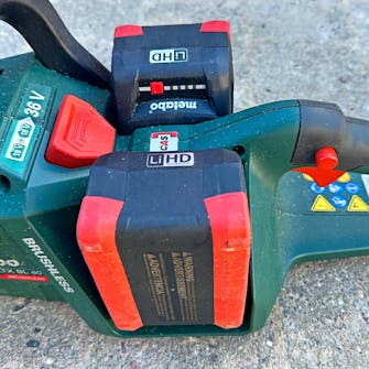 Stihlin ketjusaha katkaisi isot tolpat yhtä nopeasti kuin testin voittanut Metabon malli, mutta Stihlin täyteen ladattu akku kesti 20 prosenttia pitempään. Sitä voi pitää vaikuttavana suorituksena.