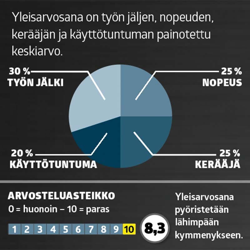 Lopuksi arvioimme käyttötuntuman eli koneiden laadun, ergonomian ja muut ominaisuudet, joita ei voi mitata tarkasti.