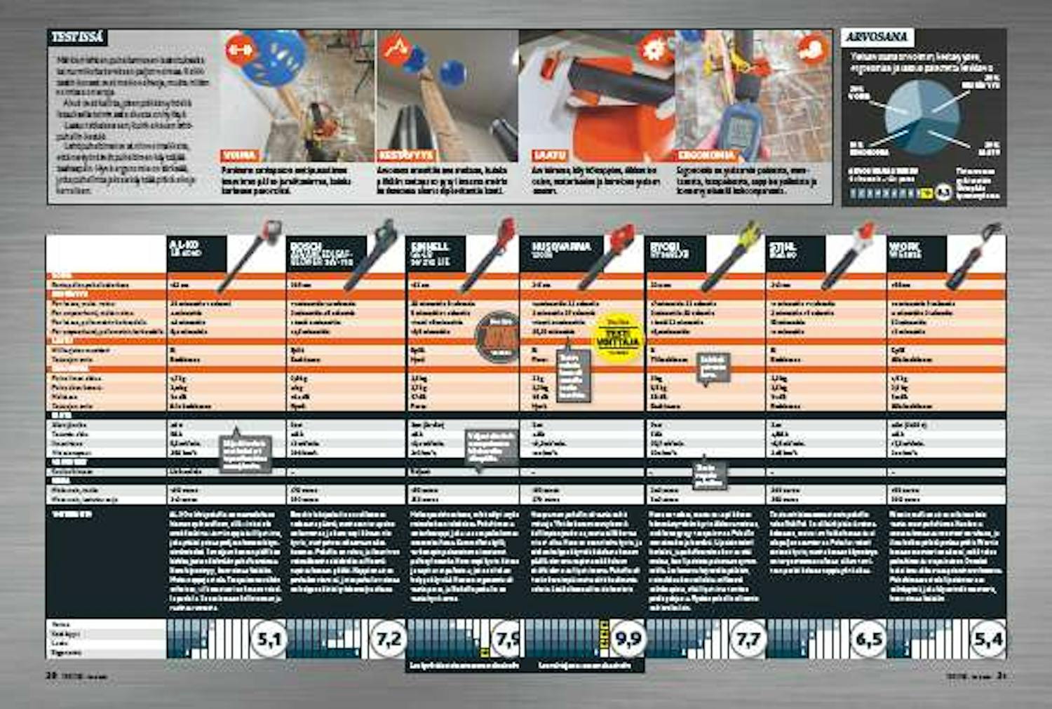 Yleisarvosana on voiman, kestävyyden, ergonomian ja laadun painotettu keskiarvo.