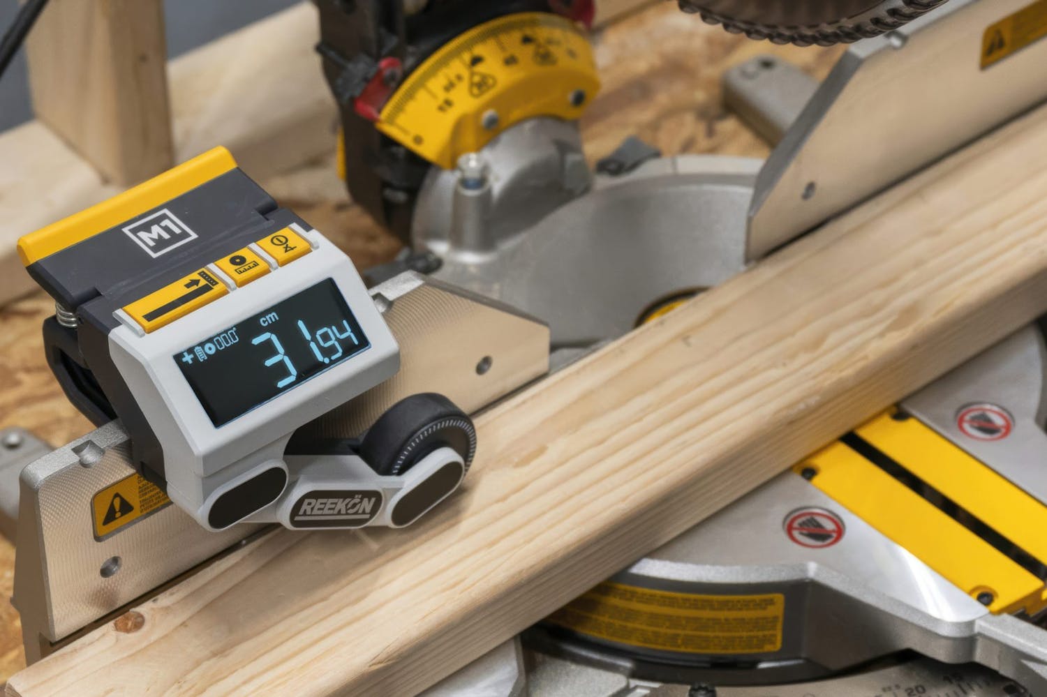Ensimmäinen sahaus varmistaa, että puu on tarkasti samassa linjassa terän kanssa. Nollaa Reekon vasemmanpuolimmaisesta napista. Näyttö kertoo nyt negatiivisen mitan, joka vastaa terän paksuutta.