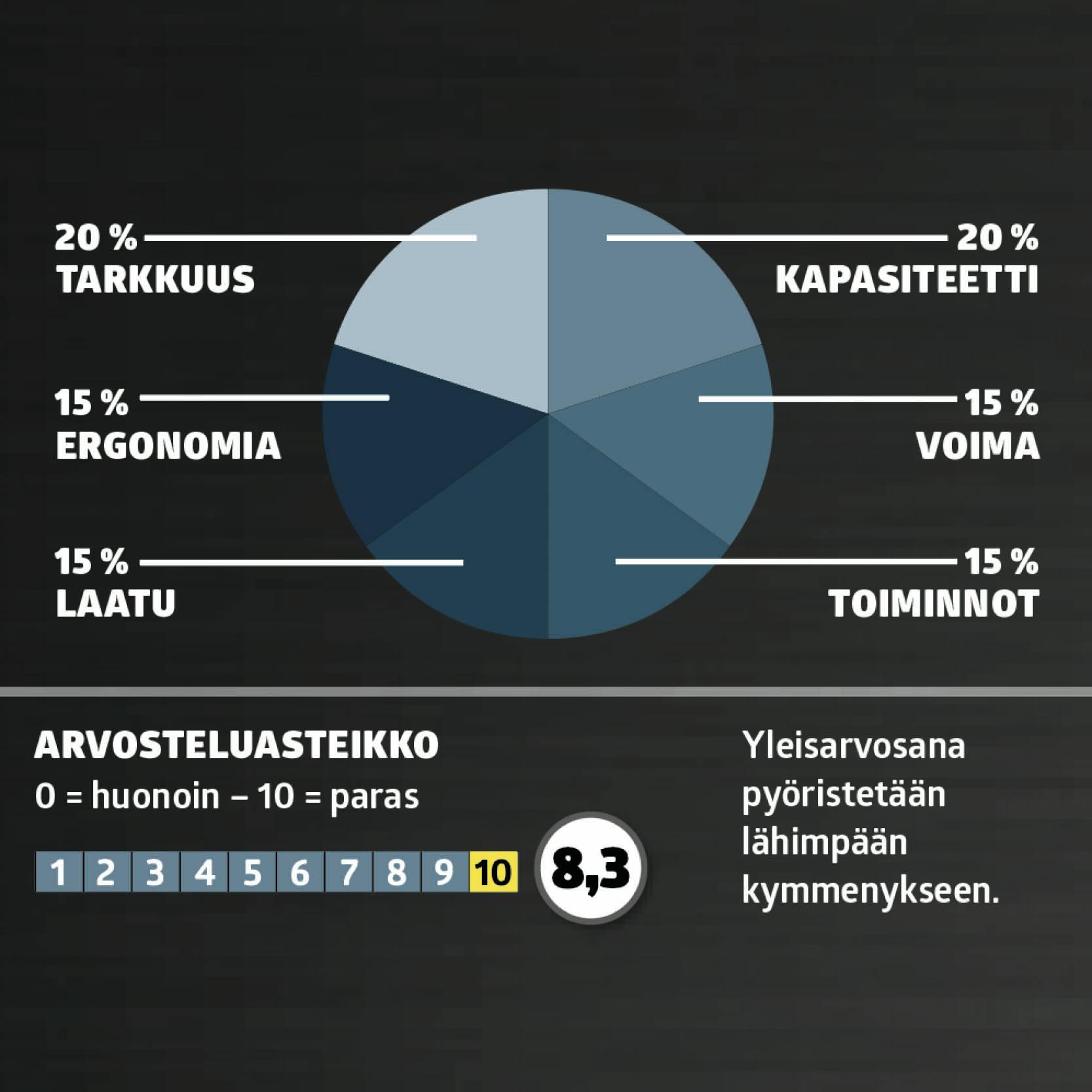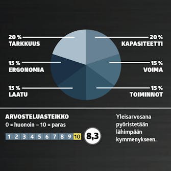Sahat testataan ja arvioidaan näillä kuudella osa-alueella: Tarkkuus, kapasiteetti, voima, toiminnot, laatu ja ergonomia.