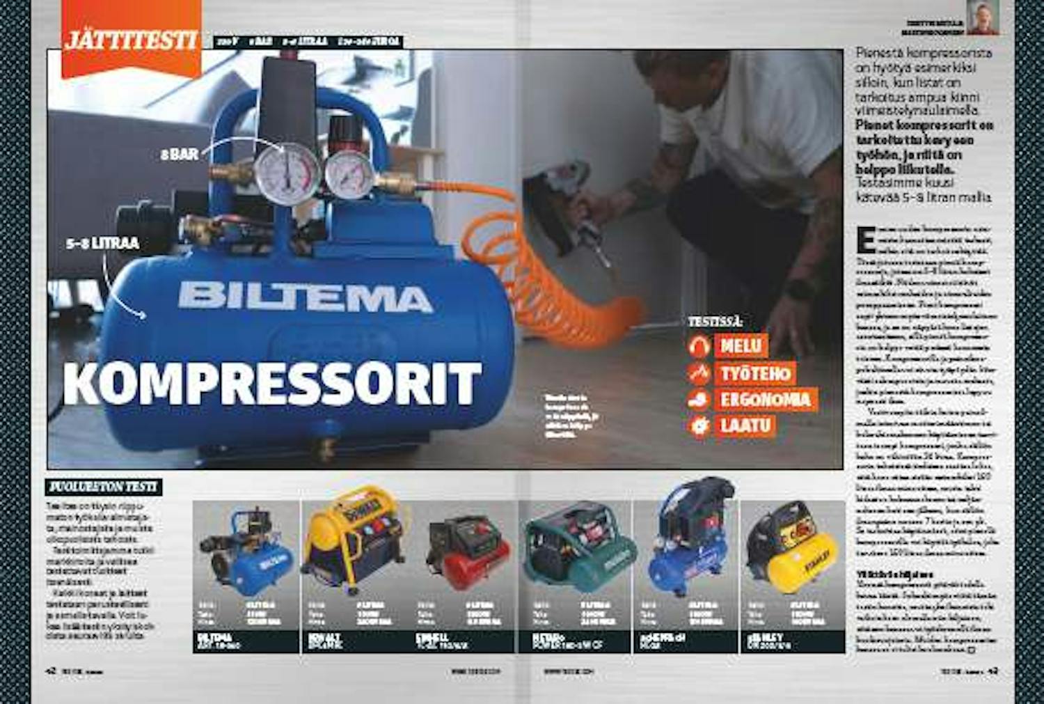 Tässä jutussa testataan pieniä kompressoreja, joissa on 5–8 litran kokoiset ilmasäiliöt. Niiden voimat riittävät esimerkiksi renkaiden ja uima-altaiden pumppaamiseen.