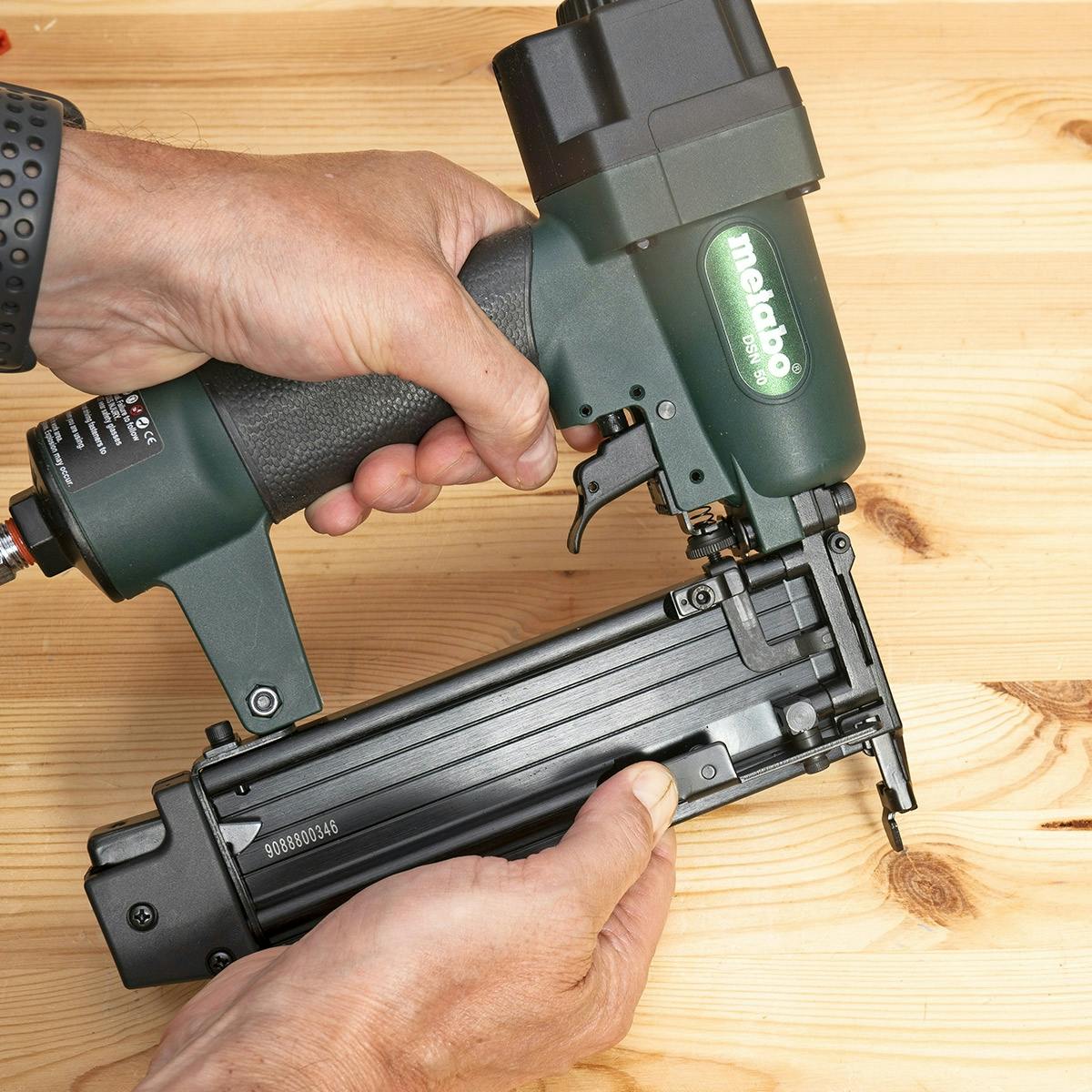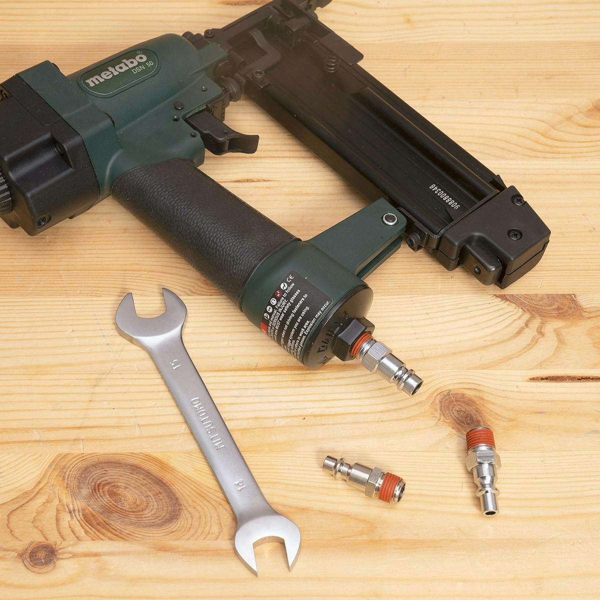 1. Metabon naulaimen mukana tulee kolme erilaista paineilmaletkun liitintä. Sen ansiosta kone sopii erilaisten kompressorien liittimiin.
