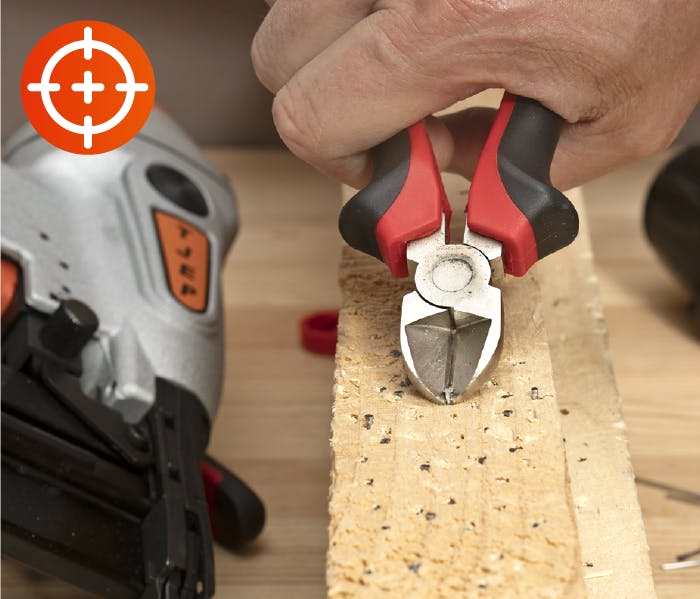 2. Kiinni juuttunut naula pitää saada irti mahdollisimman nopeasti. Tässä naulaimen kärki aukeaa helposti nappia painamalla.