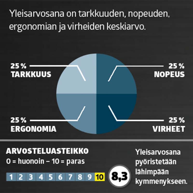 Viimeistelynaulaimet testataan ja arvioidaan näillä neljällä osa-alueella: Tarkkuus, ergonomia, nopeus ja virheet.