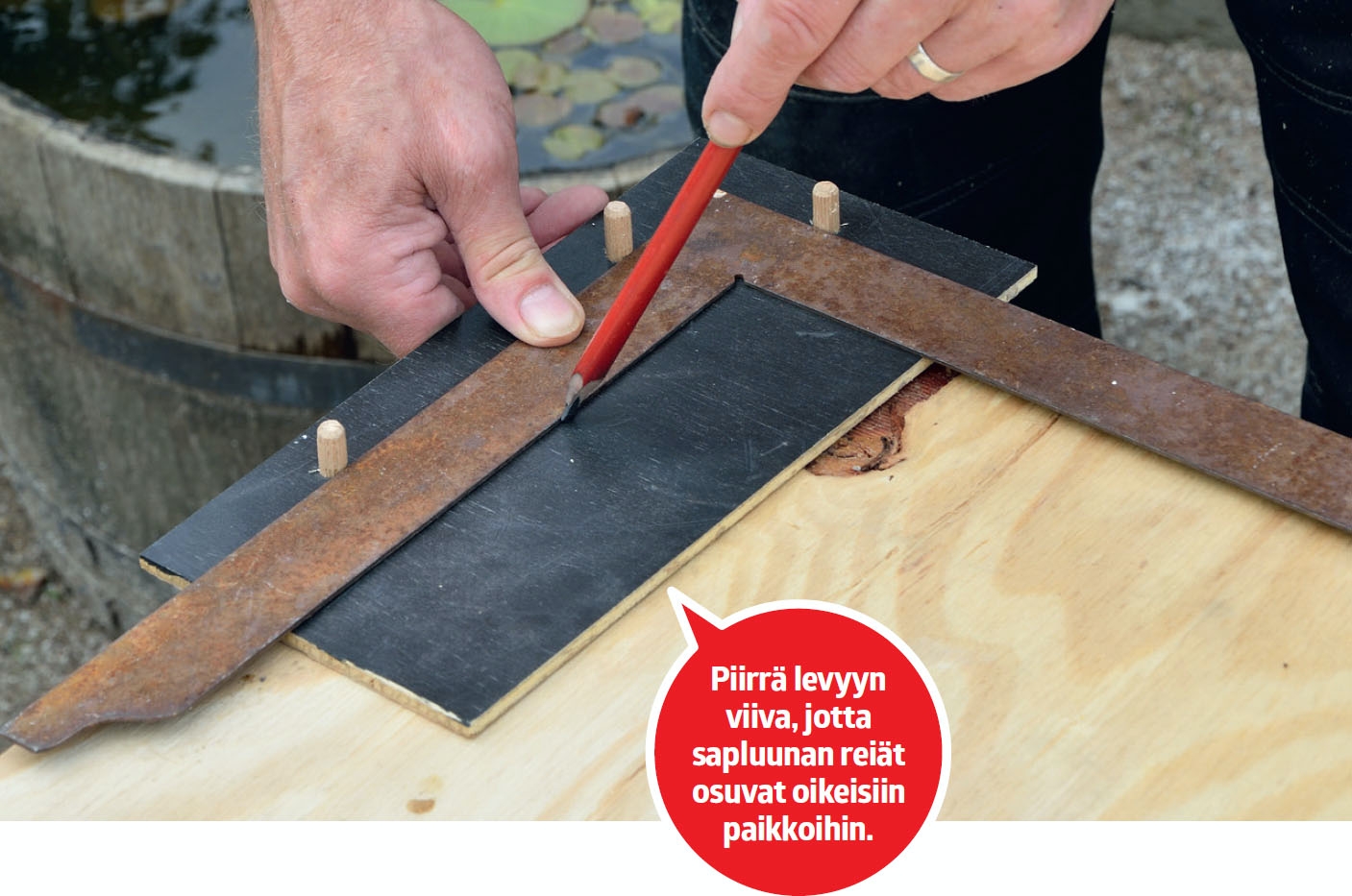 Yksinkertaisimmillaan sapluuna voi koostua laudanpät-kistä, jotka on ruuvattu suoraan kulmaan. Lautoja vasten asetetut osat pysyvät suorassa kulmassa, ja voit keskittyä ruuvaamiseen.