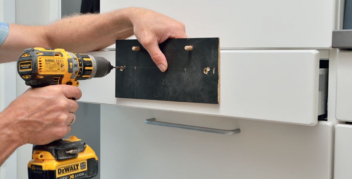 Aseta sapluuna kaapin oven kulmaan. Poraa reikä tarkasti ja rauhallisesti. Varo, ettet poraa sormeesi! Voit lisätä levyn toiseen päähän neljännen tapin, kääntää sapluunan ympäri ja porata sen avulla reiät myös toiseen suuntaan avautuviin oviin.