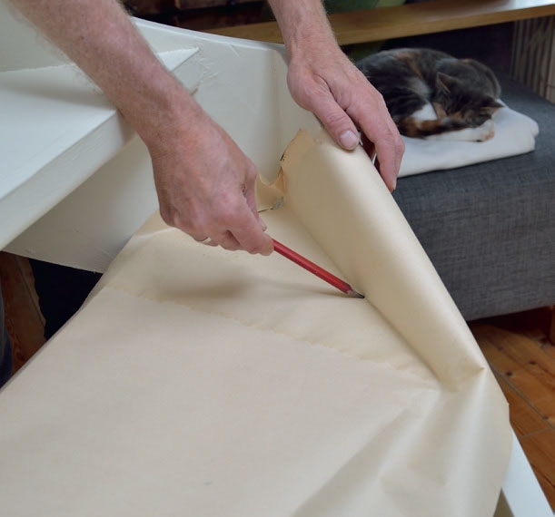 Voit käyttää sapluunaa esimerkiksi yläkerran kulmaportaiden pintojen uusimiseen. Aseta paperi portalle ja taita se huolellisesti portaan reunaa pit-kin. Leikkaa paperi taitoksen kohdalta ja käytä paperia mallina päällysteen tekemiseen.