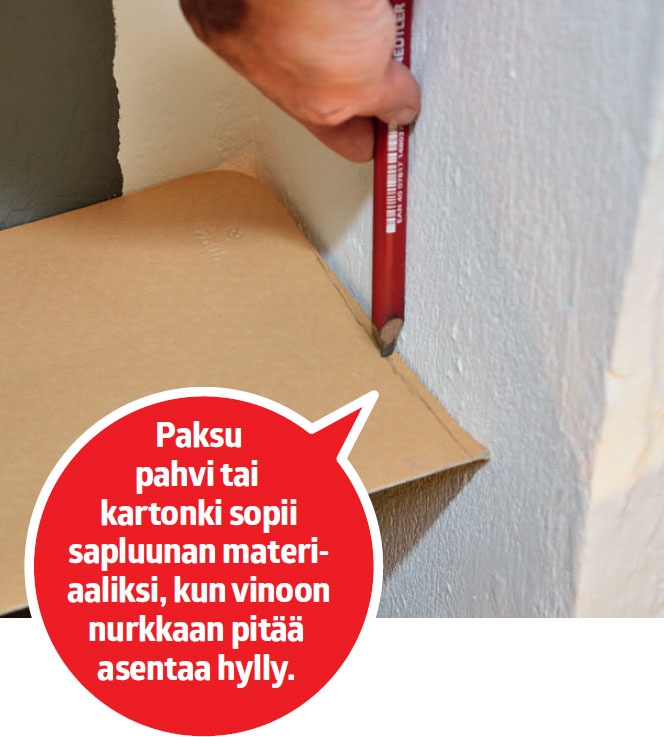 Voit käyttää sapluunaa apuna myös siinä tapauksessa, että joudut asen-tamaan hyllyjä vinoon nurkkaan. Etsi palanen paksua pahvia ja työnnä se lujasti nurkkaa vasten. Aseta leveä tim-purinkynä seinää vasten ja piirrä seinän muodot pahviin. Kynä ”kopioi” seinän epätasaisuudet tarkasti sapluunaan. Leikkaa sapluuna viivaa pitkin ja tarkis-ta, että se sopii seinän muotoihin. Siirrä sapluunan muodot levylle ja sahaa.