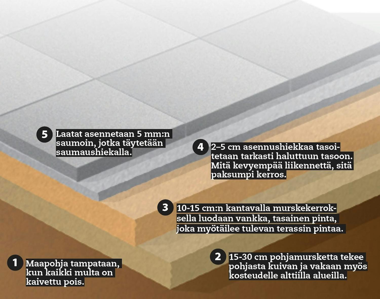 Kaivuu on päällystetyön rankin työvaihe, mutta jos vuokraat työhön minikaivurin, saat kaivettua terassille kuopan aamupäivän aikana - ilman selkäkipuja. Kun kaivat ajotietä tai terassia varten, yllätyt, kuinka paljon maata joudut poistamaan. 20 m2:n terassi 2 vaatii yleensä, että maata on poistettava noin 7 m3. Tämä on iso määrä maata käsin kaivettavaksi. Jos tontilla on tilaa, kannattaa harkita myös lavan hankkimista, jotta maan voi siirtää suoraan lavalle kaivuun tahdissa.