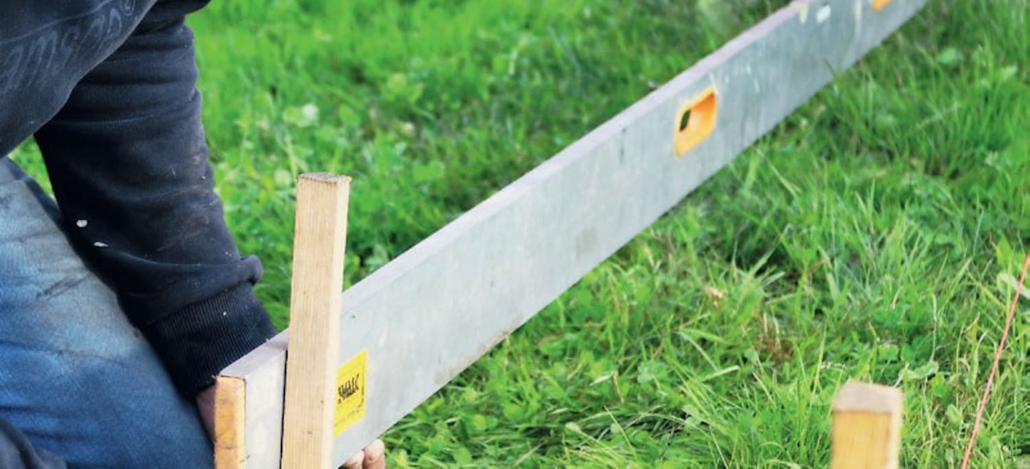 Päällysteeseen saa nopeasti ja helposti oi-kean kaadon, kun kiristää narun alueelle, jon-ka pinta halutaan oikaista kaadon mukaan. Merkitse ensin sama korkeus narun molem-missa päissä oleviin keppeihin. Siirrä sitten narua matalassa päässä halutun kaadon ver-ran. Jos haluat 2 cm:n kaadon metrille (vä-hintään 1,5 cm/m on tarpeen) ja keppien väli on 3,5 metriä, siirrä narua 7 cm alaspäin. Tee merkkiviiva, jotta näet, jos naru siirtyy.