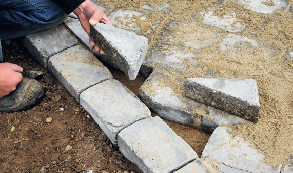 Jos haluat kiveyksesi ympärille näkyvän reunuksen, rakenna se ensin. Jos sen sijaan et halua reunojen näkyvän, työstä reunat vasta lopuksi. Näkyvä reunus koostuu betoniin asetetuista harkoista tai kivistä, jotka estävät muita kiviä työn-tymästä sivuun. Sama tulos saavutetaan näkymättömällä reunuksella, maakos-teaan betoniin tehdyllä kourulla, joka valetaan reunimmaisten kivien sivuun.