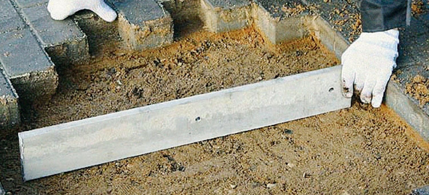 Voit käyttää päällysteen samansuuntais-ten sivujen harkkoreunuksia ohjaimina, kun oikaiset sorakerrosta. Sahaa reunasta reunaan yltävän laudan päähän lovet, niin kantava sora- ja asennushiekkaker-ros on nopea oikaista laudalla. Voit käyt-tää samaa lautaa molempiin 30 kerroksiin, kun kiilaat laudan lovesta, kun etenet asennus-hiekkakerroksen tekoon.