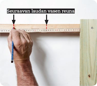 Asenna ensimmäinen lauta pystysuoran viivan mukaan, joka osoittaa laudan toisen reunan. Muista piirtää rasti sille puolen viivaa, johon lauta asennetaan.