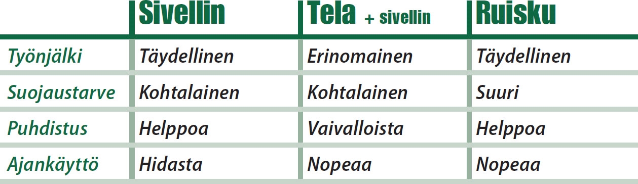 Telaa käyttämällä työ hankaloituu. Telalla ei pääse lauta väleihin, joten ne on maalattava ensin siveltimellä. Pinnat sen sijaan on nopeasti maalattu, mutta riskinä on, että sivel timenvetojen ja telattujen alueiden väliset erot näkyvät.
