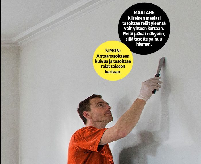 Paikatut kohdat pitää hioa huolellisesti. jotta seinästä tulee täysin tasainen. Anna tasoitteen kuivua kunnolla ennen toista kerrosta.