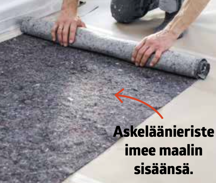 Parketin alle tarkoitettu askel- äänieriste sopii loistavasti myös lattioiden suojaamiseen. Eristeen pinta imee maalia ja estää roiskeiden leviämisen. Lattian voi peittää myös paksulla paperilla, mutta vältä sanomalehtiä ja ohutta muovia. Paperiin tulee tulee helposti reikiä, ja muovin päälle tippunut maali tarttuu kenkiin lähes takuuvarmasti.