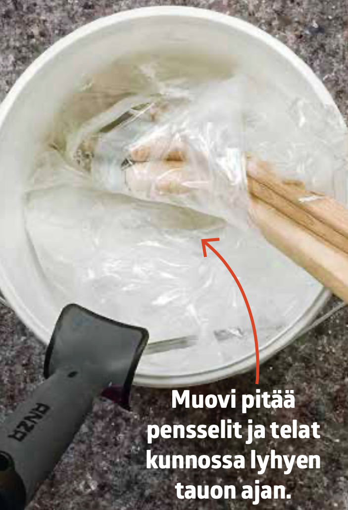 Pensseleitä ei tarvitse puhdistaa lyhyen tauon ajaksi, vaan ne säilyvät yön yli muovipussissa. Sulje pussin suu tiukasti maalarinteipillä, jotta pensseleissä oleva maali ei pääse kuivumaan.