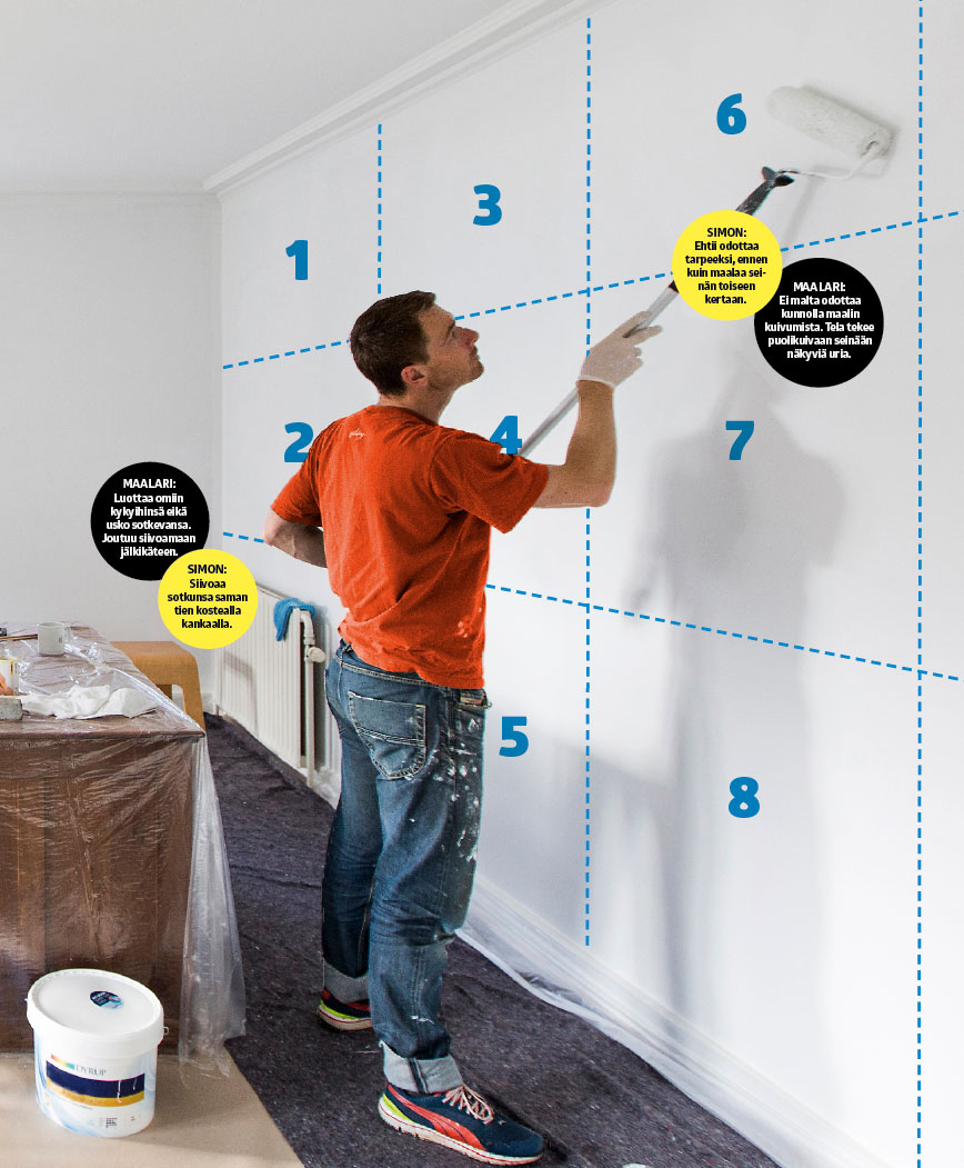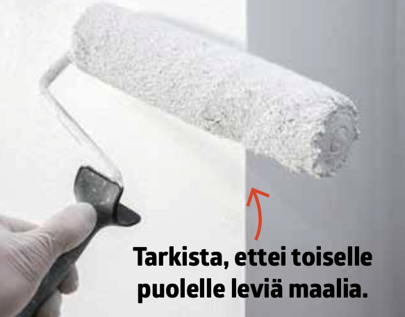 Seinään on jäänyt pitkä maalinoro, sillä maalia ei ole levitetty telalla tarpeeksi hyvin.